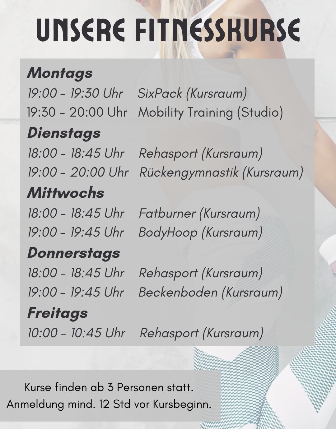 Alle Teilnehmer müssen sich zu den Kursen telefonisch oder vor Ort anmelden. Wir bitten auch um frühzeitige Abmeldungen wenn Du mal einen Kurs absagen musst.